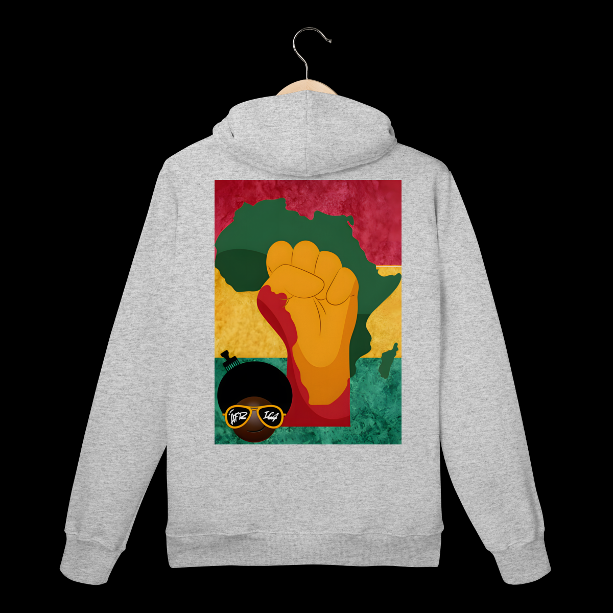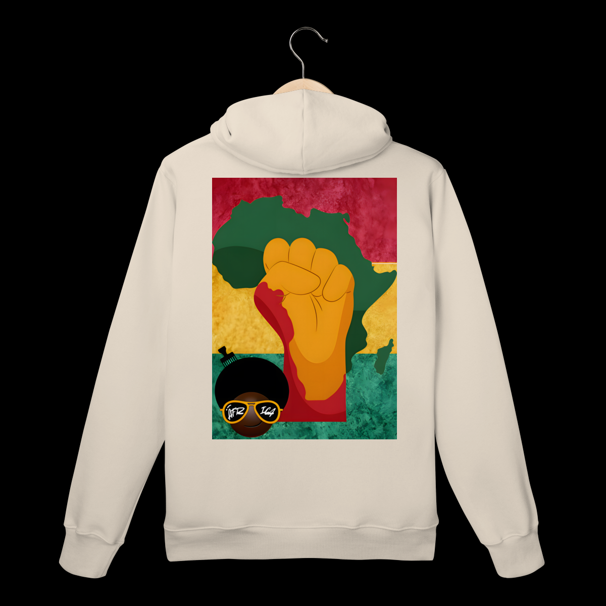 Moleton Prime Bandeira eMojubá África traz uma estampa exclusiva que conecta identidade negra, ancestralidade e estética contemporânea. Nas costas, a arte combina as cores inspiradas na bandeira da Etiópia, o mapa da África e o punho cerrado — símbolo de resistência e orgulho — acompanhados do Black Power Emoji. Na frente, o mesmo emoji aparece em destaque, reforçando presença e pertencimento.
